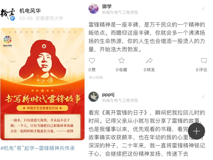 线上网络聚力,弘扬雷锋文化。学院秉承“雷锋在线,再现雷锋”的理念,以讲好雷锋故事、研究雷锋文化为目标,易班平台通过“机电‘易’起看——雷锋故事共了解”板块推送雷锋生平、雷锋日记和雷锋先进事迹,突出知识性和时代性,形成学雷锋主题教育和网络育人相融合的育人格局。