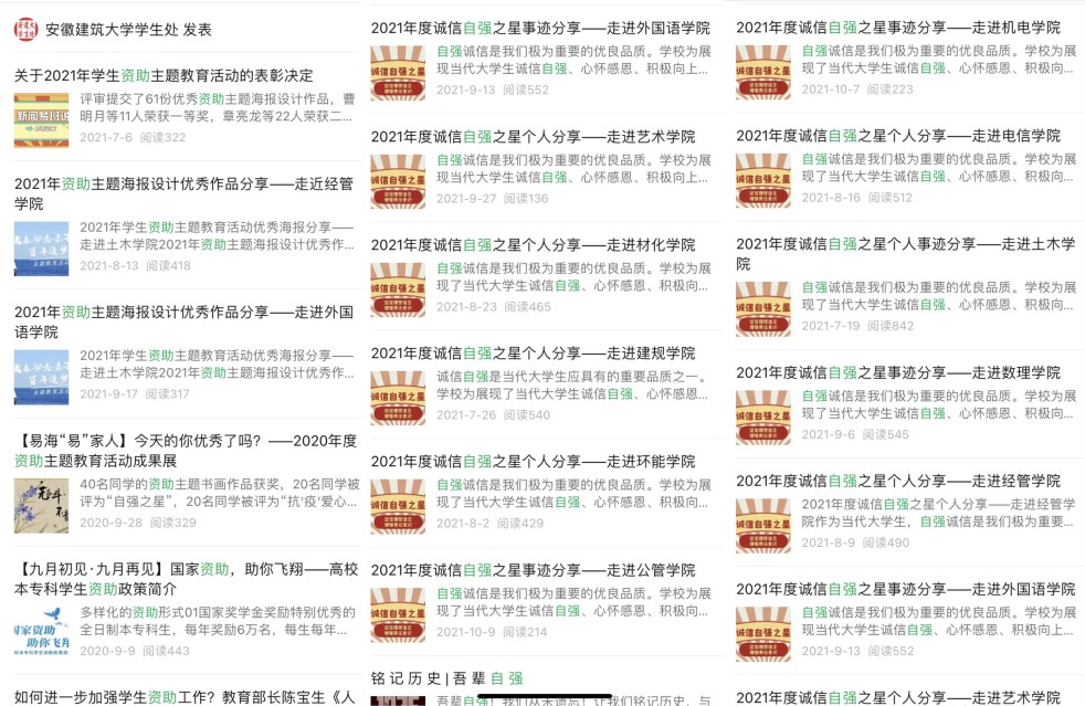 学校不断强化资助育人功能,把“立德树人”根本任务融入学生资助工作全过程。为促进校内学生资助由保障型向发展型转变,重视受助学生健全人格的发展,力争实现更高层次的教育公平,学校在全校范围内定期开展资助主题教育活动,创新活动形式,鼓励受助学生积极展示个人风采与特长,同时通过线下专访、事迹展示等多途径选树励志先进典型,鼓舞困难学子建立自信、心怀感恩、提升能力,砥砺品质、完善人格,实现自我管理和自我教育。