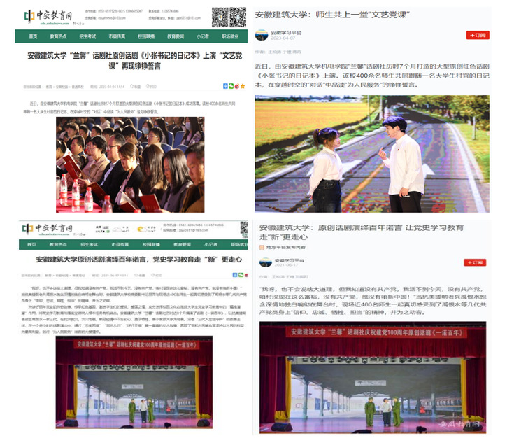 “兰馨”话剧社十五年来充分挖掘红色资源,以编演校园红色话剧为主要内容,生动宣讲党史、传播革命文化,打造形成具有“青年解读、青年演绎、青年影响”示范效应的党史宣讲模式,共上演原创红色话剧15部,校园短剧50余部。剧社作品获2012年安徽省教育厅大学生自创话剧展演活动三等奖、“安徽省青年党团员纪念五四运动100周年”党团日活动征集活动中获二等奖、2019年“青春•理想”安徽省第八届大学生自创话剧展演活动甲组二等奖等荣誉,社团于2022年获批国家级学风涵养工作室,相关红色话剧被“学习强国”“中安在线”“中国戏曲网”等媒体报道。