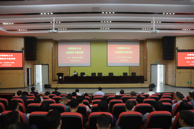 本网讯 5月15日下午,学校学习贯彻习近平新时代中国特色社会主义思想主题教育专题党课在南校区实验综合楼二楼报告厅举行。校党委书记孙道胜以“学思想 担使命 见行动 以扎实工作开创学校高质量发展新局面”为题作专题党课报告。省委第十巡回指导组副组长夏智明一行与会指导,学校领导班子成员,副处以上干部,全校党支部书记,教职工党员代表和学生党员代表参加会议。