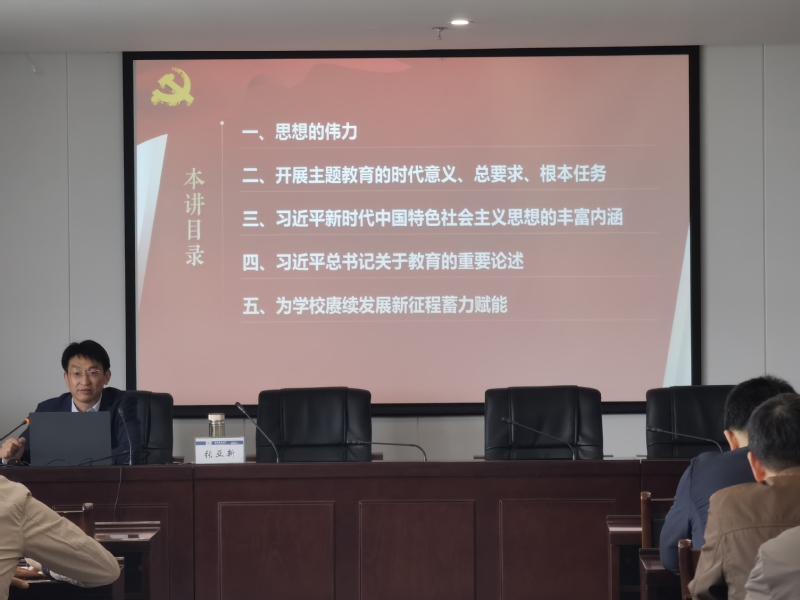 张亚新从“思想的伟力”“开展主题教育的时代意义、总要求、根本任务”“习近平新时代中国特色社会主义思想的丰富内涵”“习近平总书记关于教育的重要论述”“为学校赓续发展新征程蓄力赋能”五个方面进行全面深刻阐释,引导师生党员坚决贯彻落实党中央和省委部署要求,站在坚定拥护“两个确立”、坚决做到“两个维护”的政治高度,扎实推进学习贯彻习近平新时代中国特色社会主义思想主题教育,认真学习贯彻习近平总书记关于教育工作的重要论述,将主题教育“学思想、强党性、重实践、建新功”的总要求,落实在努力开创学校高质量发展新局面的各项工作中。