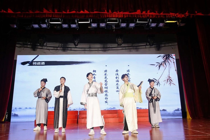 比赛中,铿锵有力的节奏掀起一波又一波高潮,嘹亮的嗓音、舞动的旋律、传神的表演令现场观众激情澎湃。每一个节目的精彩展现都是同学们刻苦练习数月的结果,比赛的顺利进行也离不开每一位工作人员的努力和学校及学院的大力支持。最后,由院学生会带来的情景话剧节目《将进酒》,为大赛画下圆满的句号。古典文化与现代艺术形成鲜明对比的同时充分诠释了中华优秀传统文化的艺术魅力。