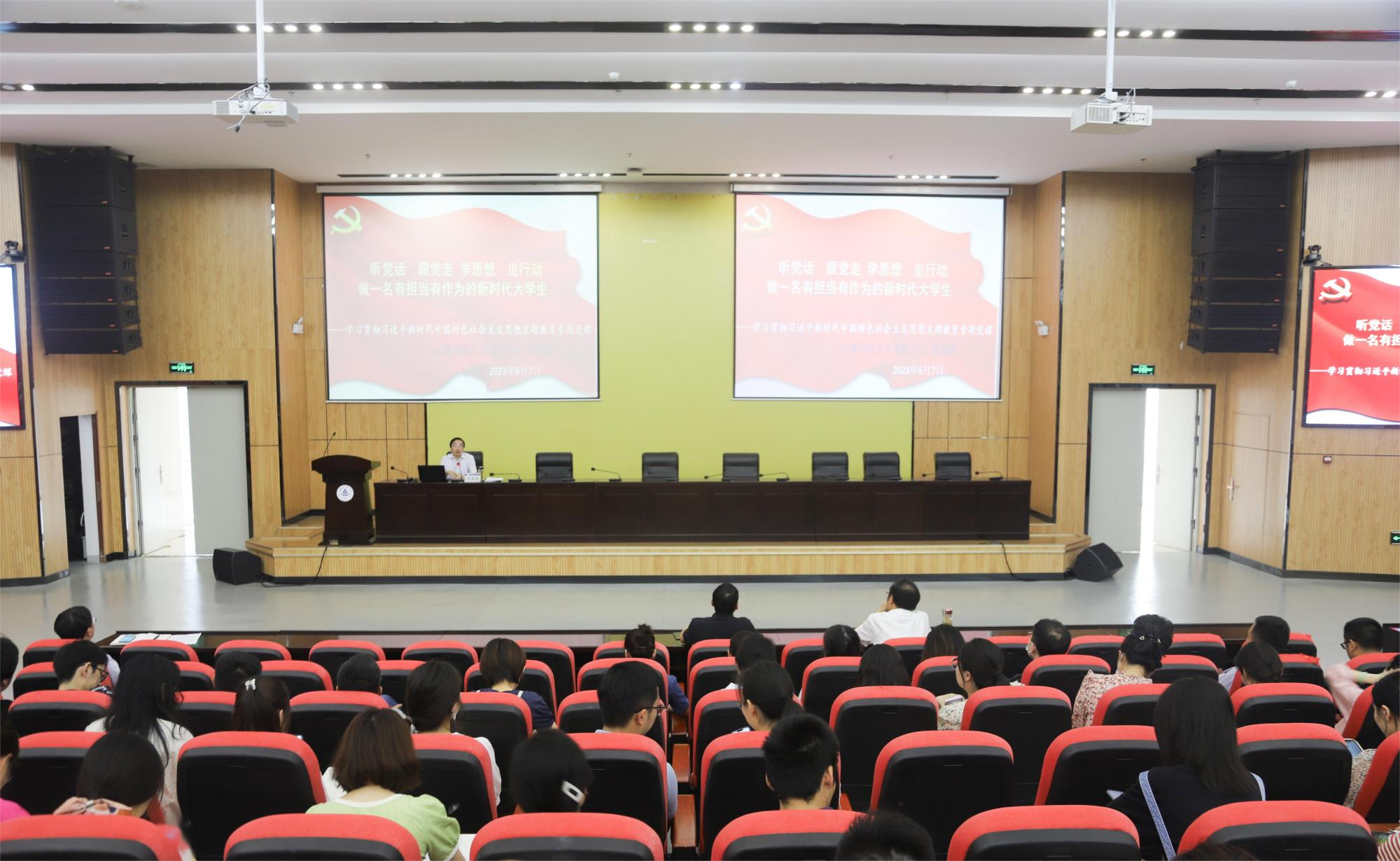 本网讯 6月7日下午,学校学习贯彻习近平新时代中国特色社会主义思想主题教育专题党课在南校区实验综合楼二楼报告厅举行。校党委书记孙道胜以“听党话、跟党走、学思想、见行动,做一名有担当有作为的新时代大学生”为题作专题党课报告,学校2023年第二期党员发展对象、机关第一党委党员干部、马克思主义学院教师360余人参加党课报告会。