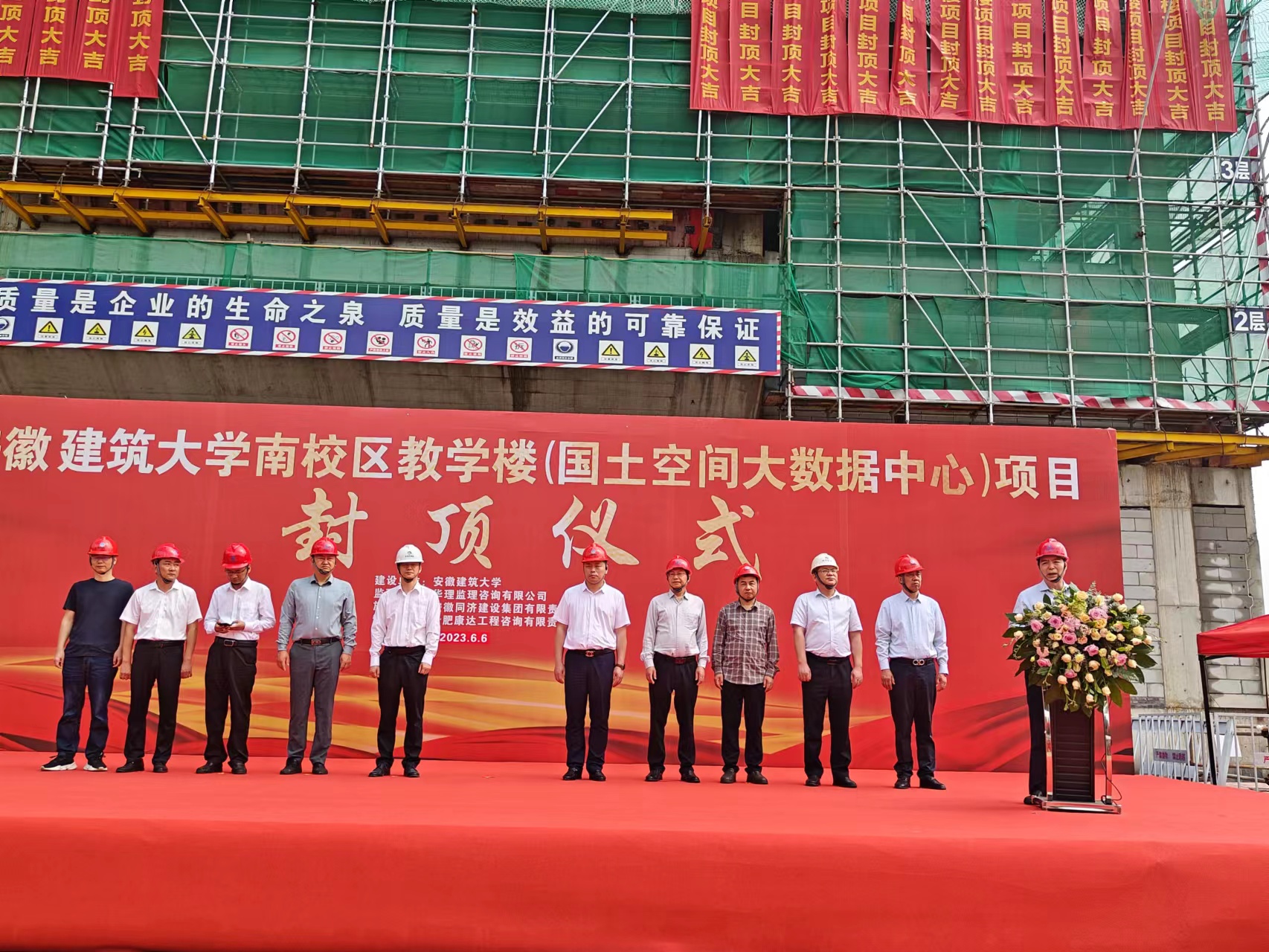 上午9时28分,国土空间大数据中心封顶仪式正式开始,校党委副书记、校长黄显怀,校办公室、财务处、国资处、招标办、信网中心、后勤集团等相关负责人共同出席本次封顶仪式。黄显怀代表ku游官方致辞,他对施工单位、项目管理公司、设计单位、监理单位及相关单位表示衷心的感谢,对长期以来奋战在施工一线的全体参建人员致以崇高的敬意和诚挚的问候。