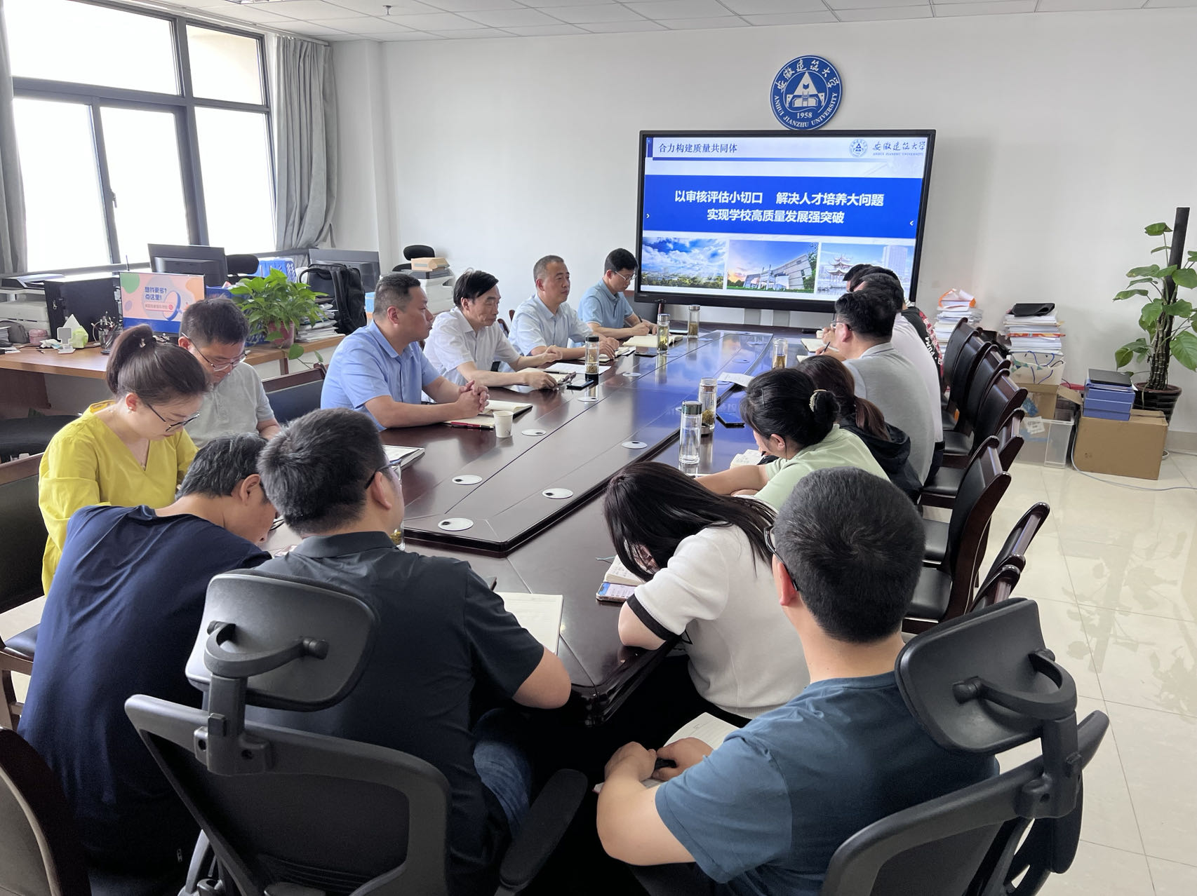 本网讯 6月8日下午,学校审核评估领导小组组长、校党委书记孙道胜赴评建办调研指导审核评估工作。审核评估领导小组副组长、评建办主任、副校长闵杰主持会议,评建办全体成员及校办有关人员参会。