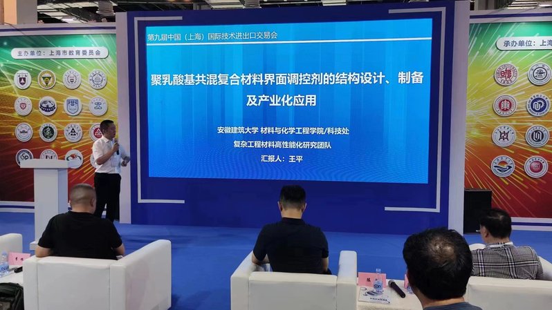上交会由商务部、科技部、国家知识产权局和上海市人民政府共同主办。我校“聚乳酸基共混复合材料界面调控剂的结构设计、制备及产业化应用”“非接触可操作自助教育终端”2项科技成果参展。材化学院王平老师进行项目路演。
