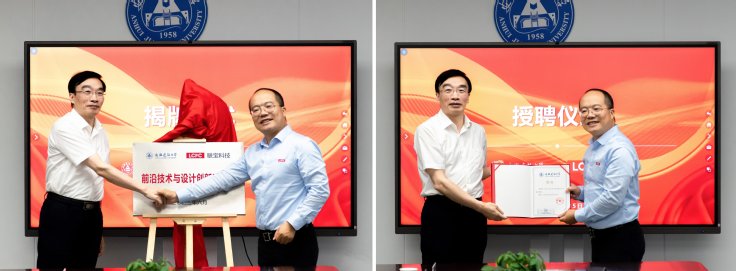 孙道胜与袁康共同为前沿技术与设计创新工作室揭牌,孙道胜为袁康颁发客座教授聘书。