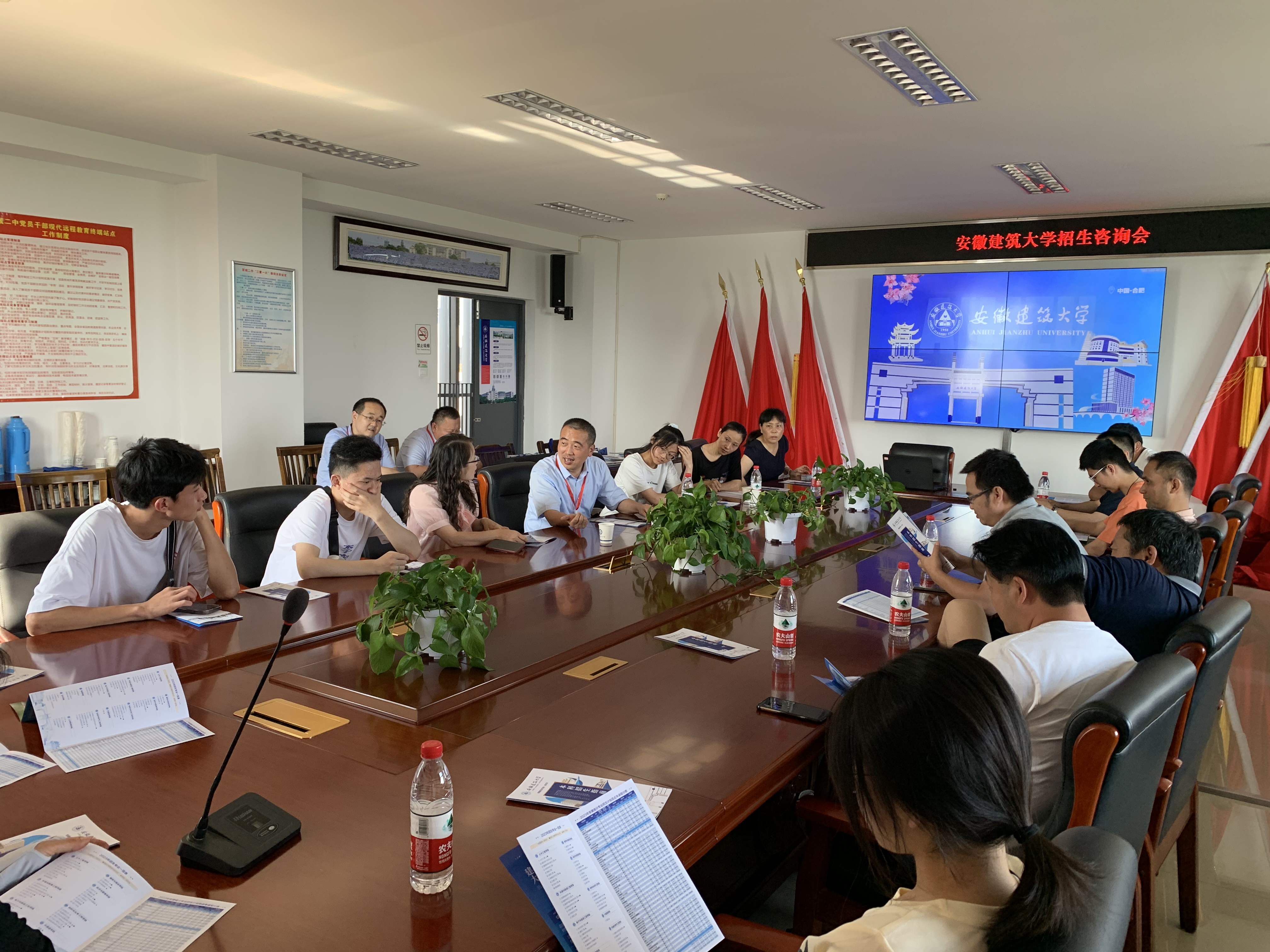 6月26日上午,闵杰一行与当涂一中校领导、教务处领导和毕业班班主任开展了座谈交流,闵杰详细介绍了学校的地理区位、专业设置、师资队伍、教风学风、就业流向和校园环境等相关情况,诚邀当涂一中多向我校输送优秀学子,共建优质生源基地,共育优秀青年人才。