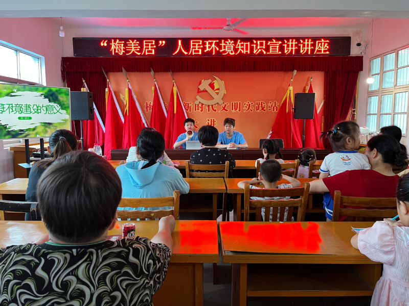 “梅美居”人居环境知识讲座。大学生志愿服务团的师生在梅林村会议室举办人居环境知识宣传讲座,为留守老人、妇女、儿童以及基层干部进行政策导读。讲座由人居环境讲座与安全知识讲座两部分组成,介绍了人居环境的重要性、反诈骗宣传与防范措施、夏季防溺水教育等,以图文并茂的方式向群众普及了相关知识,旨在改善农村人居环境、提高村民安全意识与防范诈骗能力。