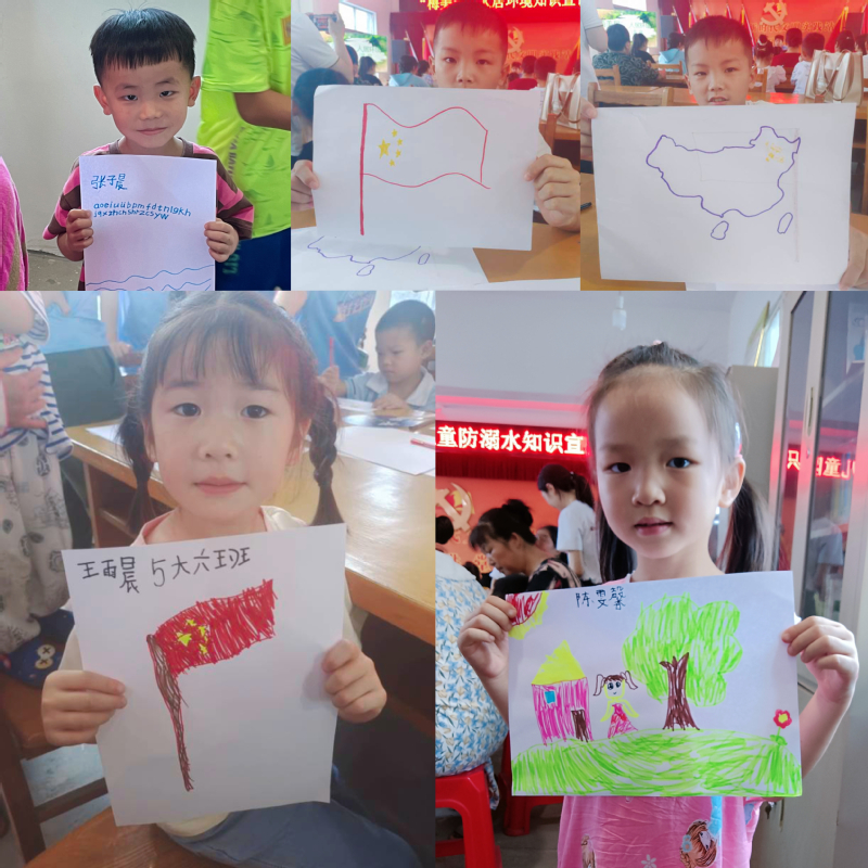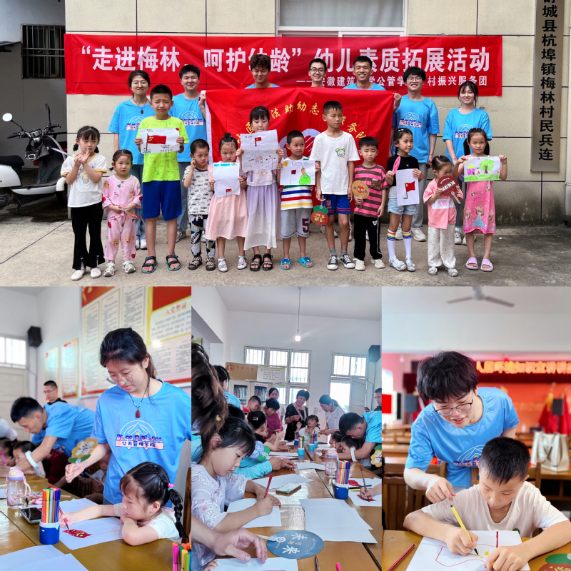 幼儿多彩成长素质拓展活动。梅林村有近30名留守儿童,为丰富小学生的暑期生活、进行潜移默化的爱国主义教育,志愿服务团组织儿童开展绘画教学活动。小学生在大学生的帮助下认识并临摹国旗与中国地图,用画笔描绘心中的美好家园、用语言描述心中热爱的祖国.....绘画结束后,服务团的大学生带领小朋友展开了别开生面的趣味游戏,希望以多样化的趣味活动促进留守儿童的全面发展。