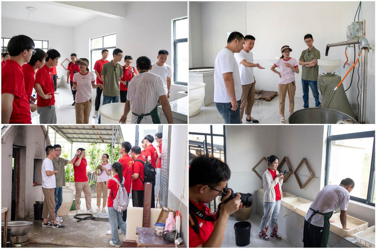 7月6日,在寿县八公山乡大泉村,村委会书记来宝、驻村工作队队长程鹏热情接待了实践团一行,带领实践团参观了八公山特色豆腐小镇、豆腐文化馆、玛瑙泉。座谈会中,来宝详细介绍了大泉村围绕豆腐小镇名片,凝聚小作坊、企业、政府合力,大力发展豆腐深加工和休闲旅游融合发展等方面的工作。希望机电学院依托专业优势,对大泉村形象提升、文旅产品设计、历史文化发掘与传承、特色农产品机械化、标准化加工等方面提供智力支持。何鹤立简要介绍了机电学院近年来在人才培养和社会服务等方面取得的成就。随后,实践团队走进豆腐制作工坊,全程记录并参与了泡豆、磨浆、过滤、煮浆、点卤、压制的一系列过程,队员们结合专业知识对豆腐产品进行文创包装设计与农户进行了沟通。