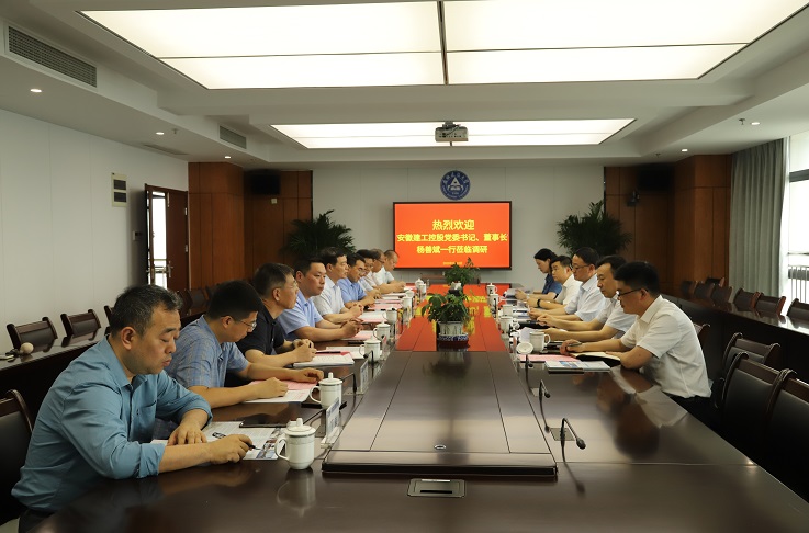 本网讯 7月12日,安徽建工控股(股份)集团党委书记、董事长杨善斌,纪委书记、监察专员王汪苗一行5人来校调研交流,学校在南校区实验综合楼21楼第二会议室召开座谈会,校党委副书记、校长黄显怀,校党委常委、副校长蔡国军及相关单位主要负责同志参加会议。
