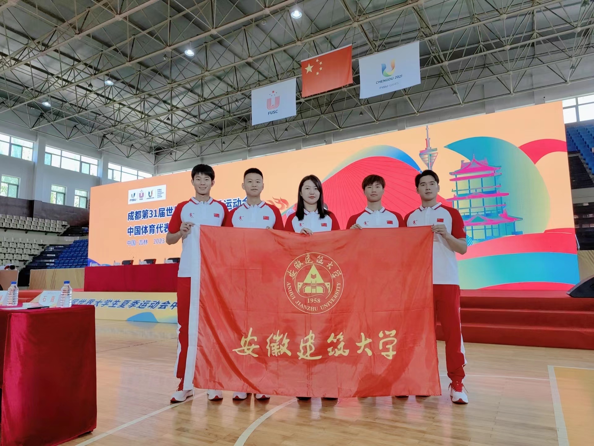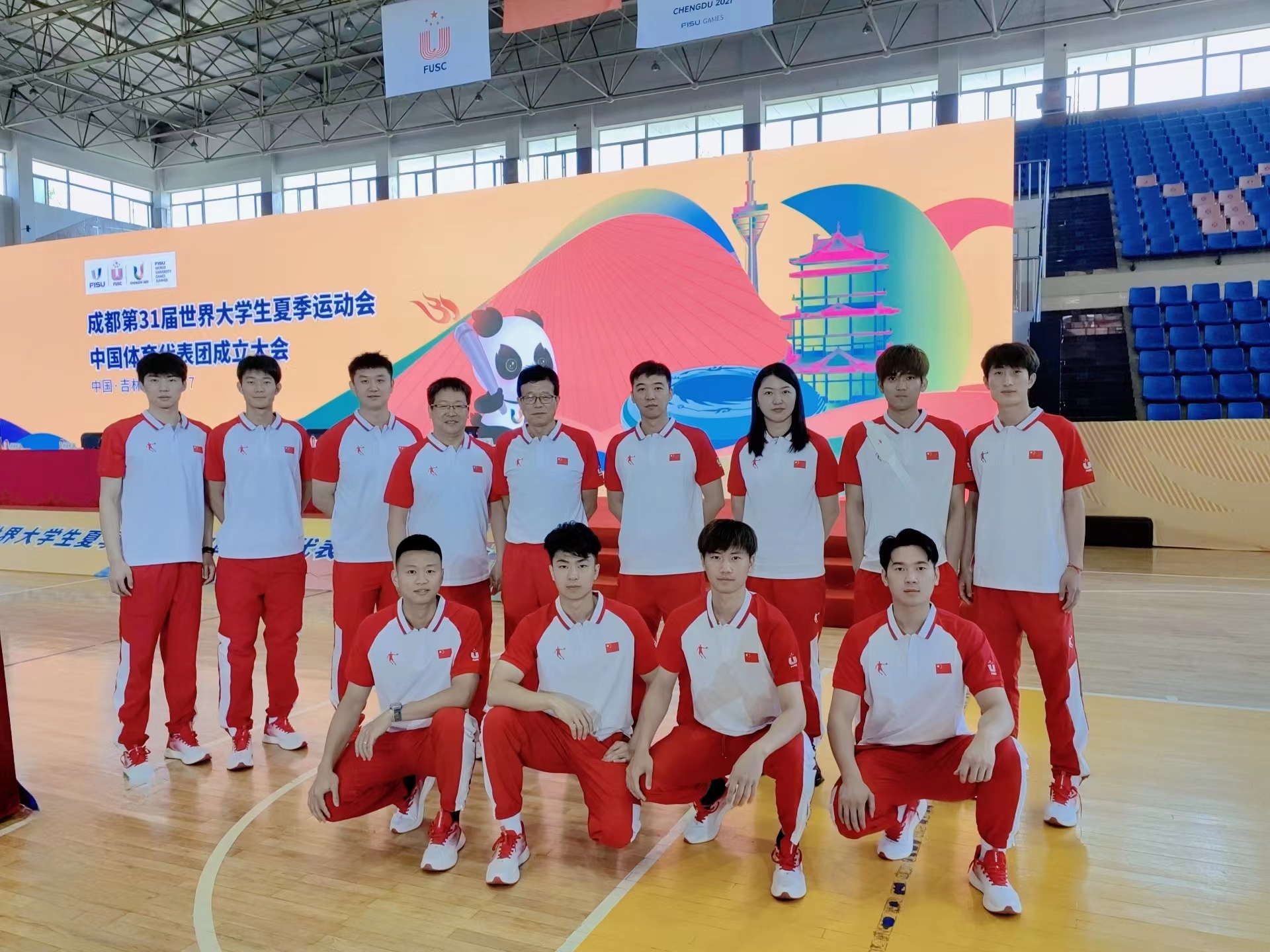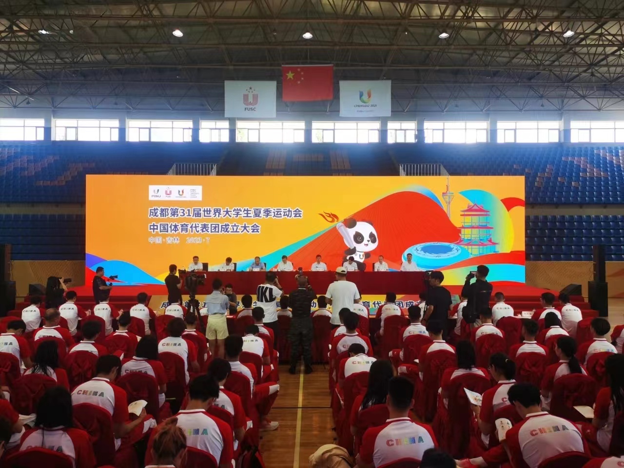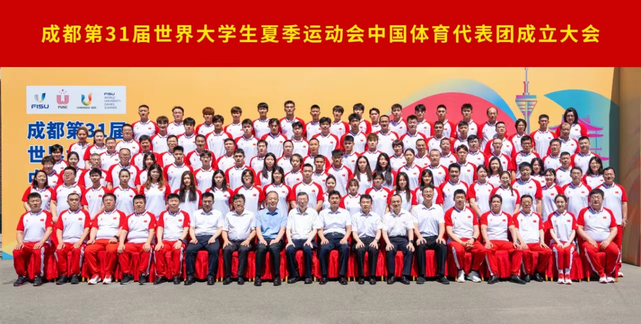 本网讯 7月12日,第31届世界大学生夏季运动会中国大学生体育代表团成立大会在长春市召开,教育部副部长、代表团团长王嘉毅,吉林省副省长梁仁哲,体育总局竞体司、教育部学生体协多位代表团领导出席会议,代表团运动员、教练员及有关工作人员通过线上线下相结合的方式参加会议。我校刘晨老师和四名参赛运动员在长春参加了本次成立大会。