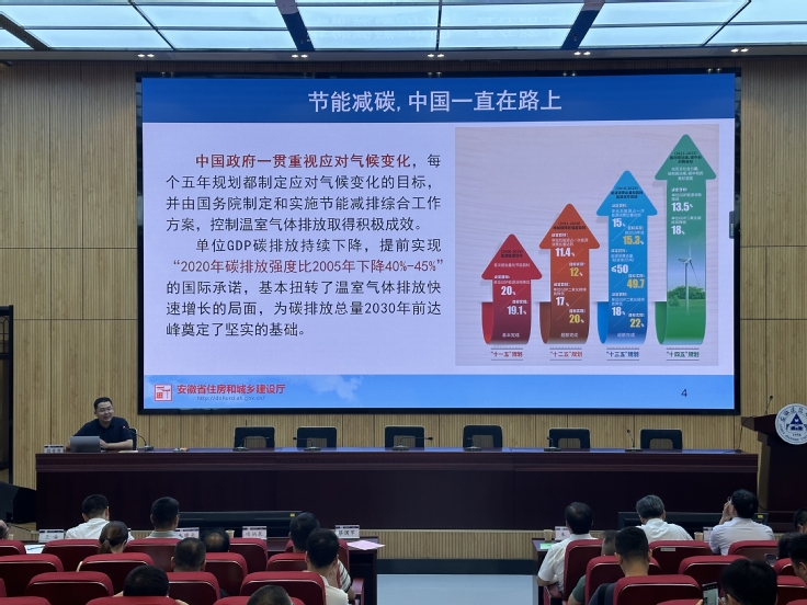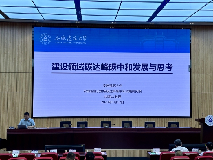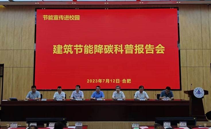 本网讯 节能宣传进校园,低碳发展讲科普。7月12日,在安徽省住房城乡建设厅指导下,我校联合安徽省建筑节能与科技协会承办了建筑节能降碳科普报告会。校党委常委、副校长蔡国军出席会议。省住房城乡建设厅建筑节能与科技处副处长朱力、胡浩威,省科技厅社发处二级调研员周军捷,三级主任科员王孝文,省发改委环资处副处长周强,省机关事务管理局一级主任科员方诚,省建筑节能与科技协会会长项炳泉、副会长叶长青,以及省节能与科技协会会员代表和学校师生共150余人参加报告会。