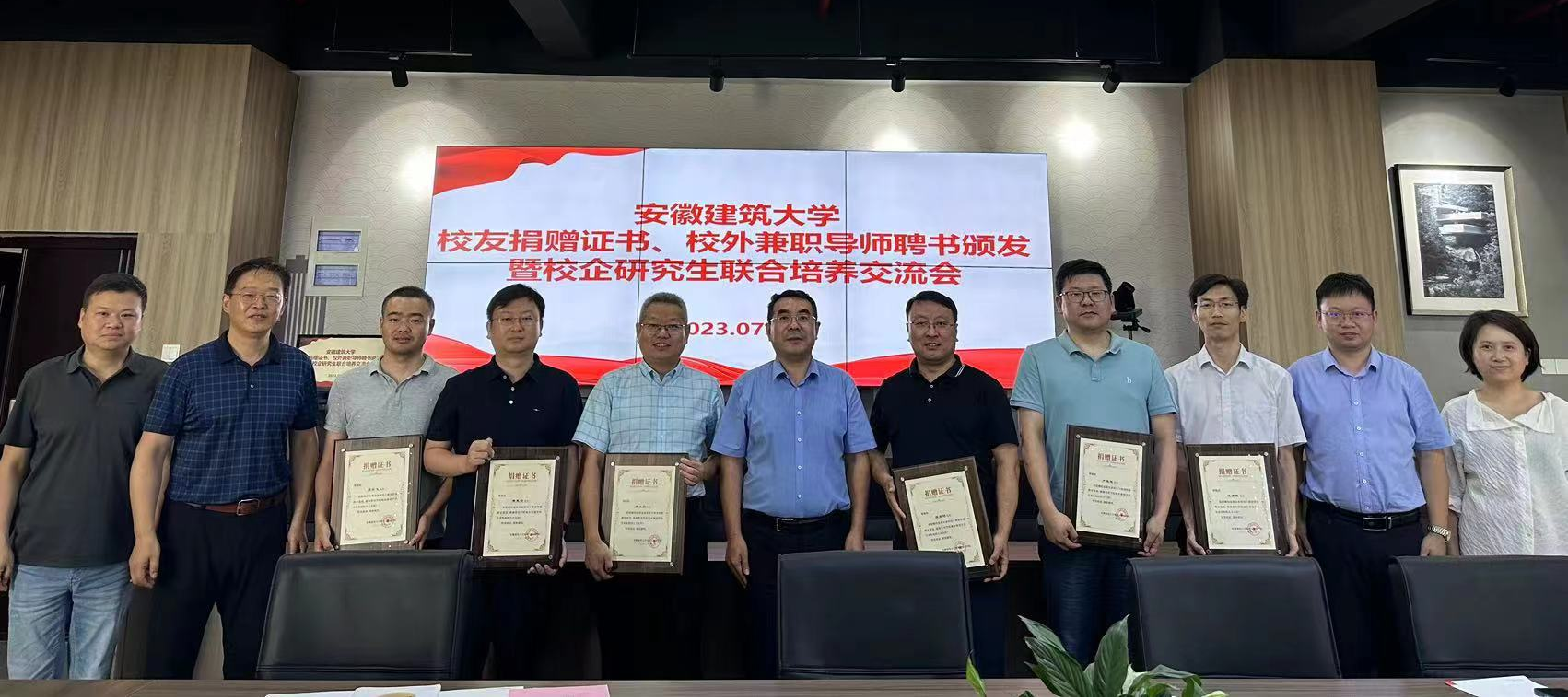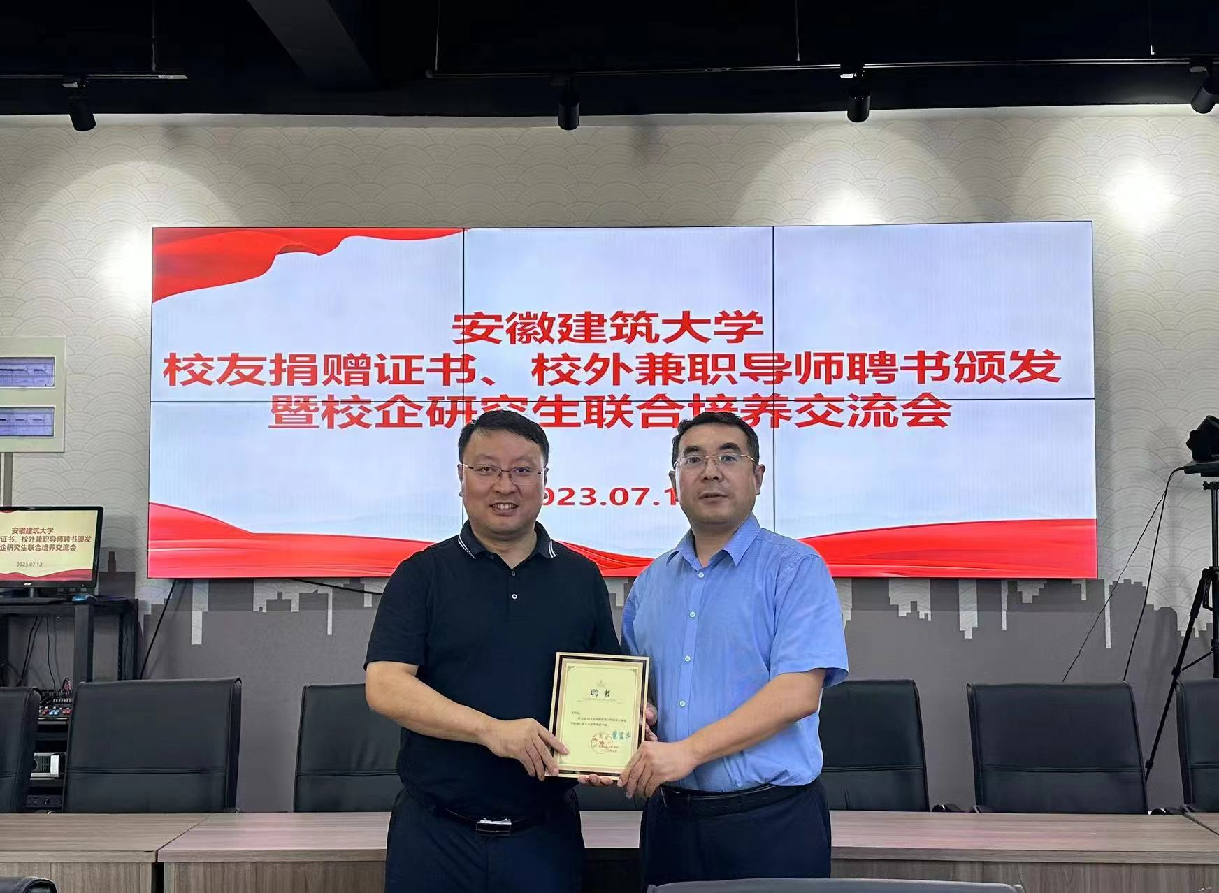 蔡国军为2023年研究生兼职导师、安徽省城建设计研究总院股份有限公司党委委员、副总经理、安徽省勘察设计大师程堂明颁发了校外兼职导师聘书;唐劲松为14名校友颁发捐赠证书。校友代表程堂明、徐从广分别介绍工作单位情况,表达了对母校培养的感谢,并承诺积极参与学院的专业、学科建设,助力学院研究生培养取得更好成绩,对研究生联合培养提出相关建议。