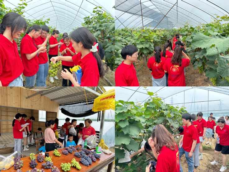 在沈弄村葡萄基地,同学们走进葡萄种植大棚,了解葡萄种类、种植情况、销售情况等,与负责人进行交流,结合自身专业积极为葡萄产业在宣传营销、网店开设等方面提供了有效建议。