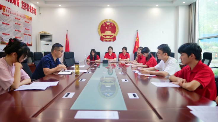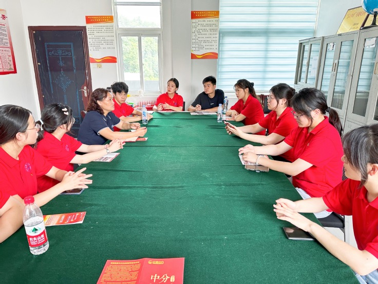 在繁昌区峨山镇政府,峨山镇党委副书记潘兵与同学们亲切交流,他详细介绍了峨山镇的基本情况和乡村建设特色成果。同学们依次介绍负责的“互联网+”、“大学生创新创业训练计划”等赛事项目的基本情况,交流为当地提供如品牌宣传、纪录片制作、文创产品、葡萄销售、自建房节能改造等服务的可能性。峨山镇团委在座谈会后,积极为实践团提供相关支持,协助开展自建房节能改造问卷调查。