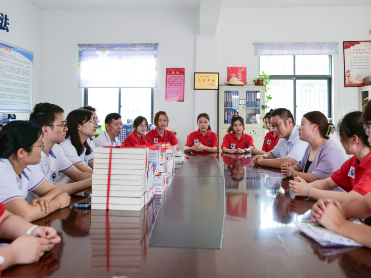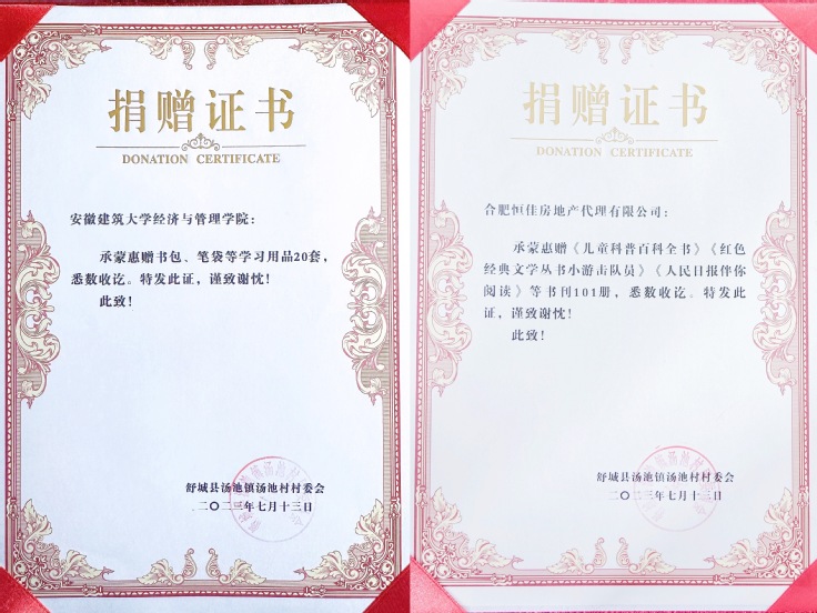 在舒城县汤池村党群活动中心,村委会对经管学院社会实践团的到来表示热烈欢迎。学院领导老师及校友王任正同村里14位学生代表近距离沟通交流,了解同学们的生活学习情况,并给他们送上精美的书包和文具,鼓励孩子们努力学习,回馈家乡,报效祖国。同时,优秀校友王任正代表合肥恒佳房地产代理有限公司,向汤池村捐赠百本爱心图书,助力乡村教育,促进文化下乡。