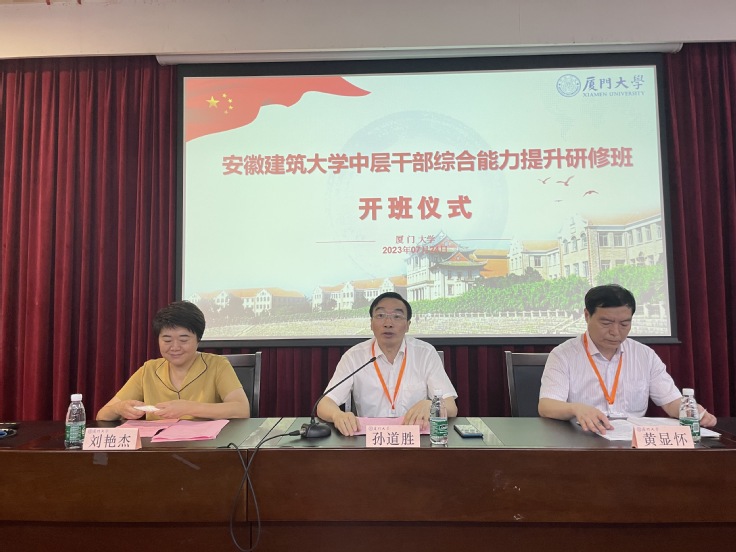 本网讯 为深入学习贯彻习近平新时代中国特色社会主义思想和党的二十大精神,推深做实主题教育,深刻领会习近平总书记关于党的建设的重要思想、精神实质和实践要求,深刻领悟“两个确立”的决定性意义,坚持用党的科学理论武装头脑,指导实践、推动工作。7月24-27日,学校2023年中层干部综合能力提升研修班在厦门大学顺利举办,校领导、学校中层干部及民主党派负责人127人参加培训班。校党委书记孙道胜,校党委副书记、校长黄显怀,厦门大学公共事务学院党委书记刘艳杰出席开班仪式。