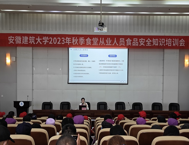 本网讯 为全面做好秋季学期校园食品安全工作,落实食品安全主体责任。近日,后勤服务集团邀请安徽承安食品安全服务有限公司的培训老师,在南校区图书馆五楼报告厅举行ku游官方2023年秋季学期食堂从业人员食品安全知识培训会。经开区锦绣市场监督管理场所有关同志到会指导培训工作,后勤集团负责人及相关部门人员、各食堂经理和新老员工共230余人参加培训会。