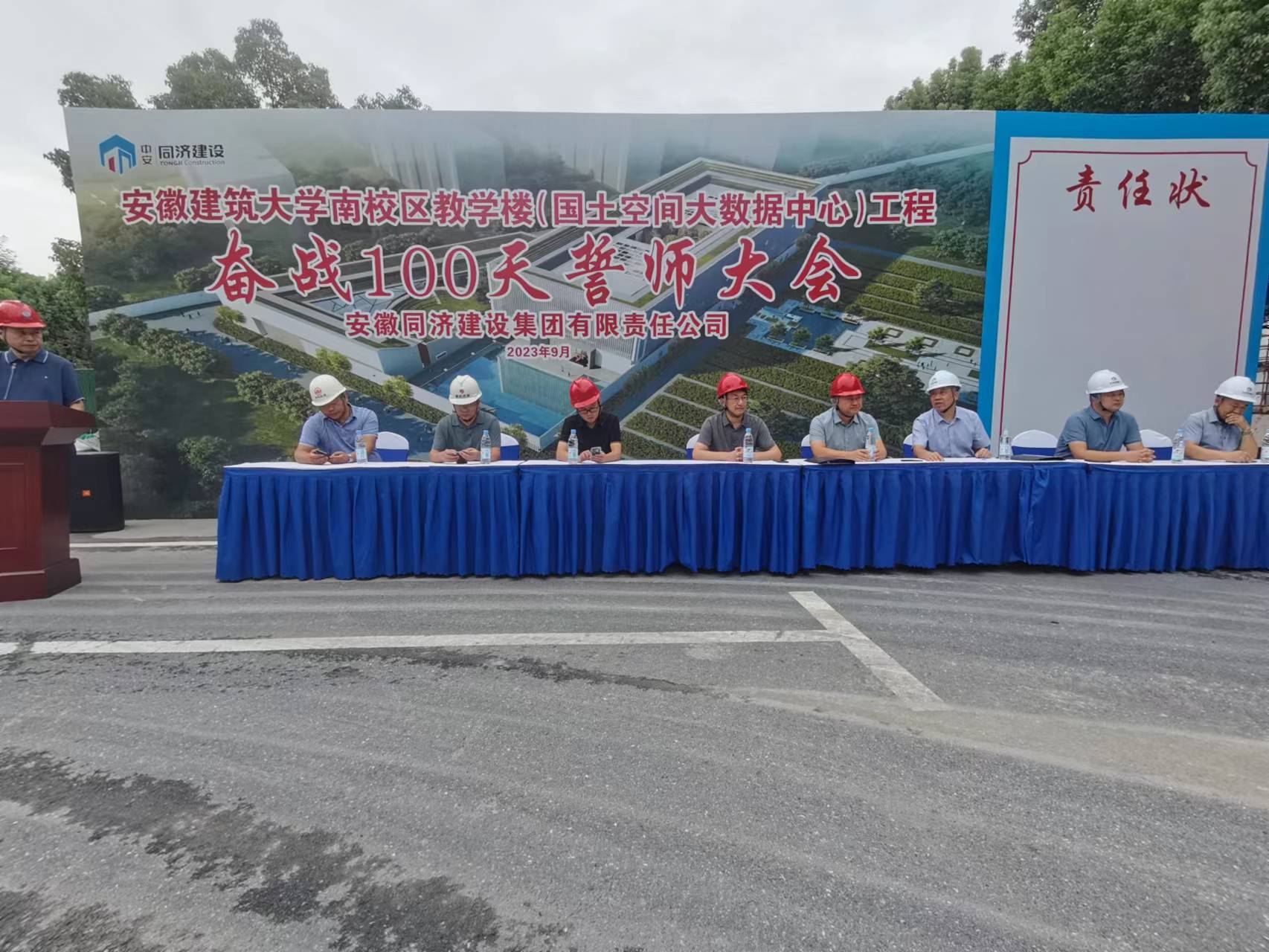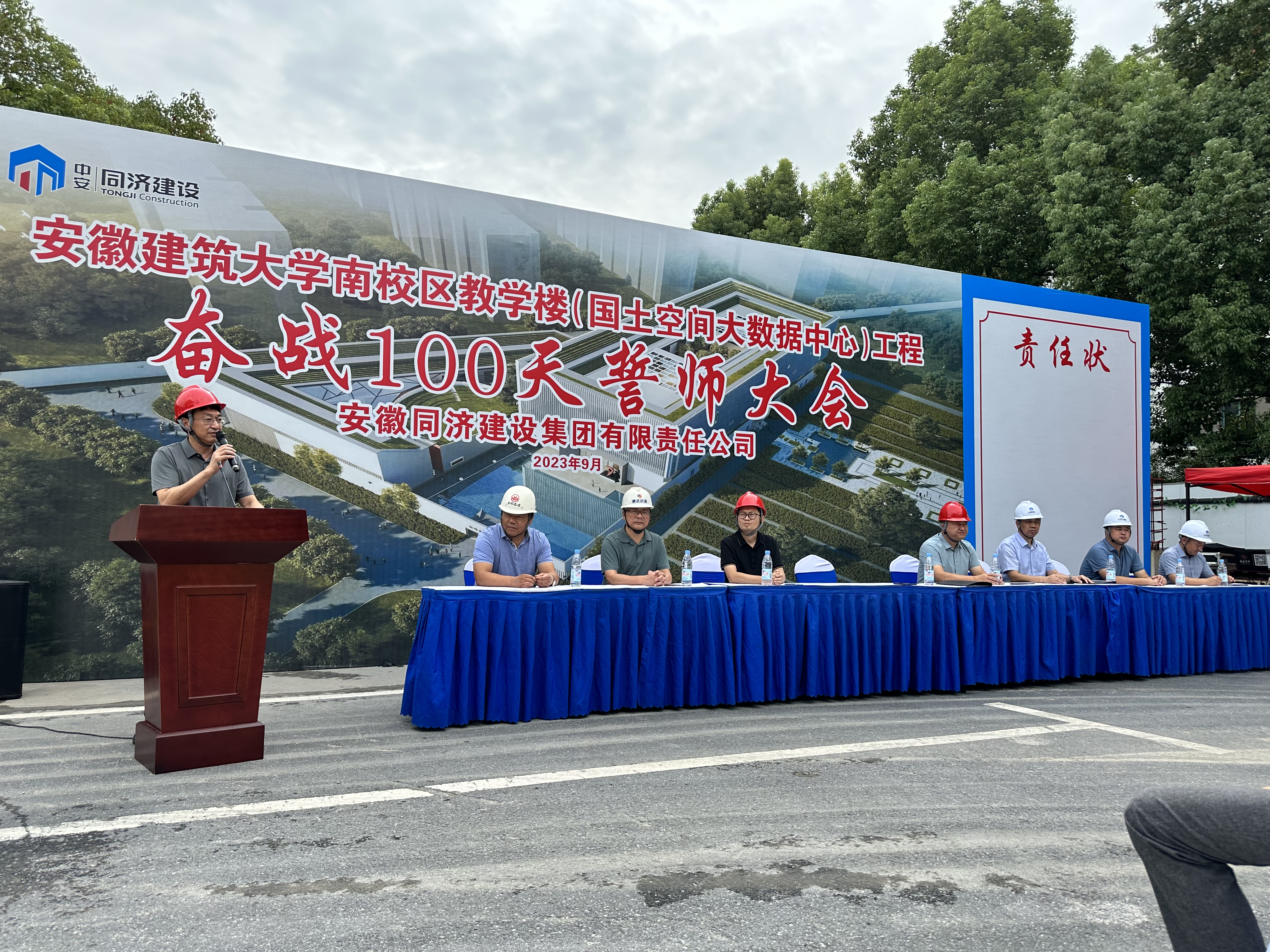本网讯 为确保按期按质完成建设任务,9月15日上午,南校区教学楼(国土空间大数据中心)施工现场举行工程“奋战100天”誓师大会,掀起工程建设全面冲刺新热潮。校党委常委、副校长张亚新,国资处(基建办)、施工单位、监理单位、项目管理公司等相关负责人共同出席本次大会。