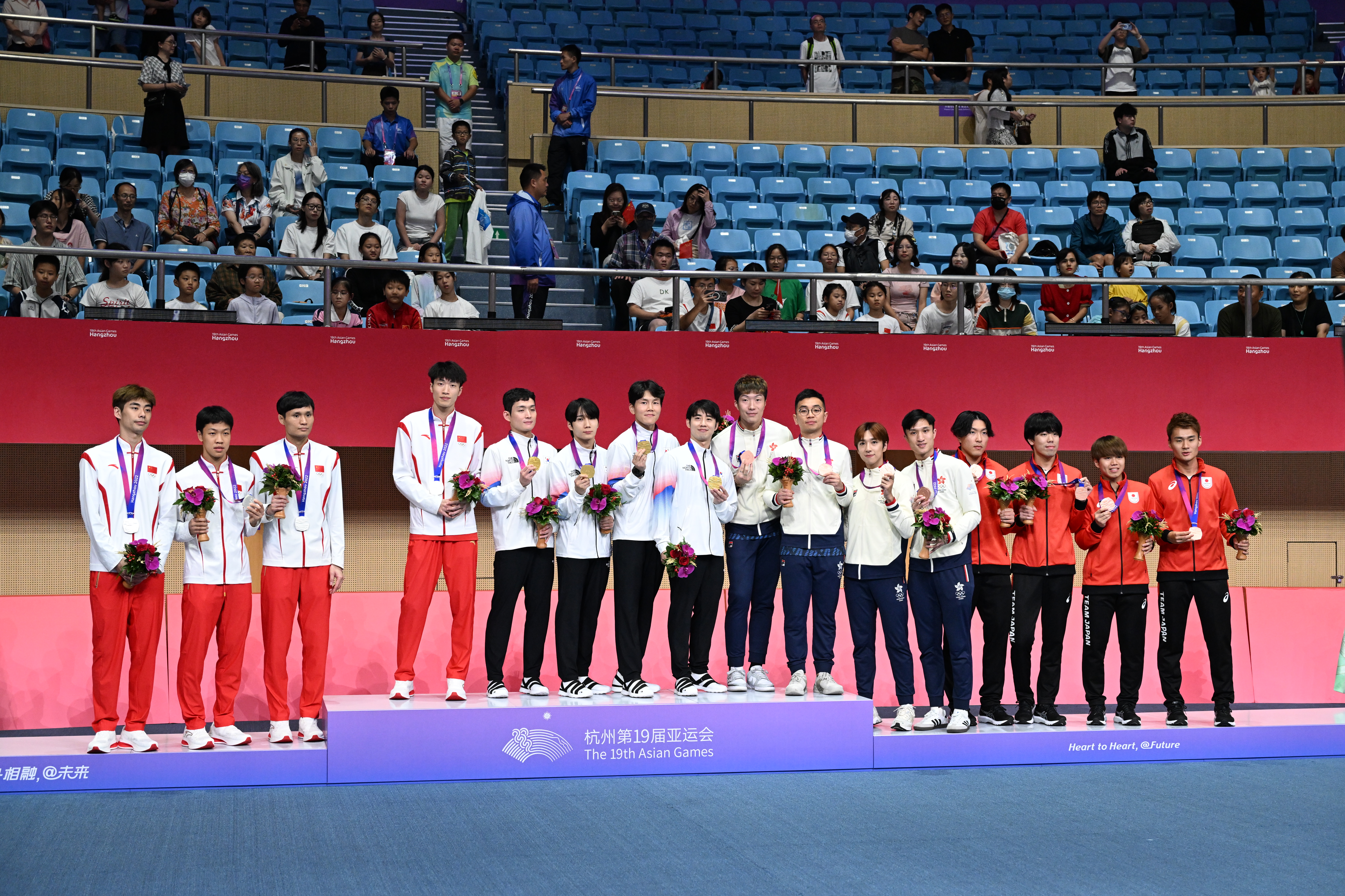 本网讯 9月27日,第十九届亚运会击剑比赛进入第四天,男子花剑团体赛开赛,我校高水平运动员吴斌、陈海威与两名队友代表中国队共同征战男子花剑团体比赛,并夺得男子花剑团体银牌。