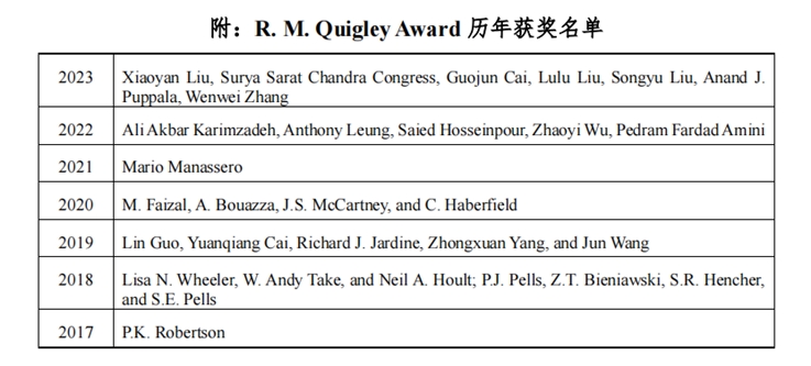 该奖设立于1973年,原名“加拿大岩土工程学会奖”,1995年更名为“R.M.Quigley Award”,以纪念R. M. Quigley博士(1934-1995)在岩土工程和地质环境领域做出的杰出贡献。该奖旨在表彰前一年度在《Canadian Geotechnical Journal》(国际三大权威岩土期刊之一)上发表的最佳论文(全球每年仅1篇)。(文/图:聂利青;审核:王媛)