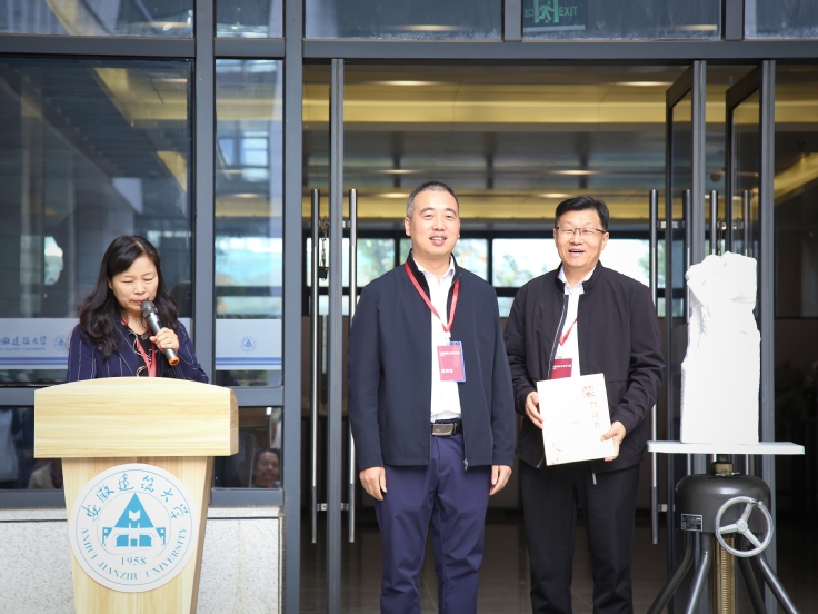 艺术学院1995级环艺专业校友、淮北市刘开渠纪念馆馆长、安徽省雕塑协会副会长刘开辉先生,向母校捐赠汉白玉雕塑作品《蜕变》,该作品荣获2023中国石雕艺术精品展一等奖。闵杰颁发作品收藏证书。