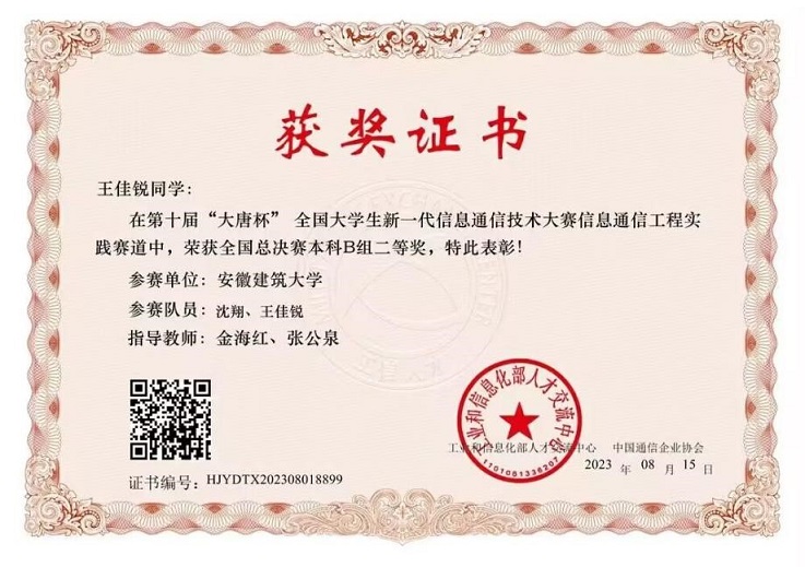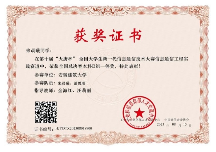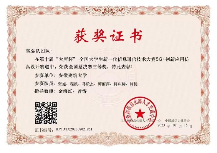 本网讯 近日,2023年第十届“大唐杯”全国大学生新一代信息通信技术大赛全国总决赛在北京圆满落幕。经省赛、国赛线上赛和线下赛等环节的激烈角逐,电信学院荣获全国一等奖1项,二等奖1项,三等奖1项,安徽省一等奖3项、二等奖4项、三等奖8项的优异成绩。