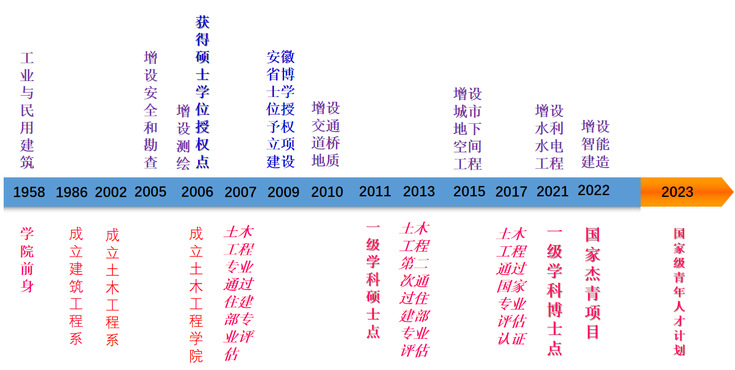 专业历史悠久。1958年9月毛泽东同志视察合肥,提出“有大希望”,随即为支援安徽建设,根据国家建筑工程部的指示,1958年9月组建安徽建筑工程学校,首批开设工业与民用建筑(我校土木工程专业前身)、硅酸盐两个专业。