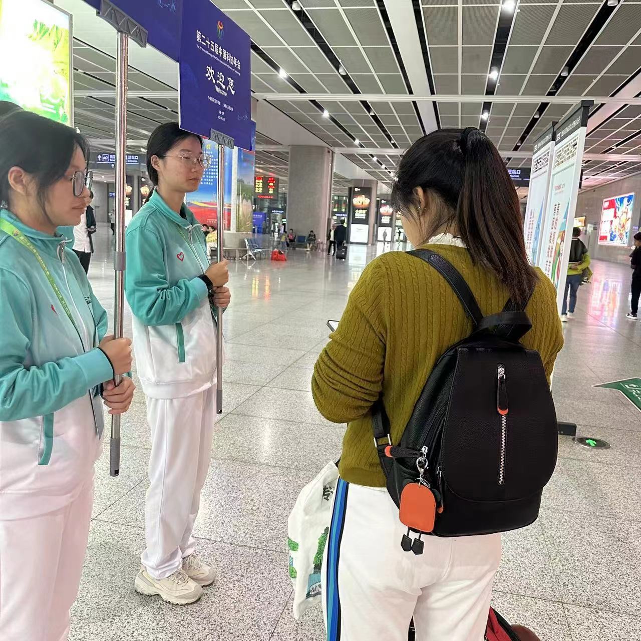 从征集志愿者到志愿者培训,从出征前动员到年会圆满闭幕,经过层层选拔,我校37名大学生志愿者被会务组分配到交通组,负责在机场、合肥南站和合肥站进行接送机(站)服务。受天气的影响,许多航班晚点,直到深夜,我们的志愿者仍在机场进行着服务工作。我校大学生志愿者们兢兢业业、任劳任怨,早出晚归、接机接站,同学们以自信、热情、细致、不怕苦、不怕累的精神得到嘉宾的一致好评。