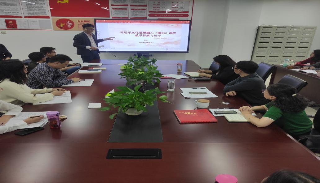 本网讯 为深入学习贯彻习近平文化思想,不断提高思想政治理论课教学针对性和实效性,马克思主义学院近日在主教楼1711会议室开展了集体备课会活动。备课会由毛泽东思想和中国特色社会主义理论体系概论教研室张弢老师主讲,分享主题是“习近平文化思想融入《毛泽东思想和中国特色社会主义理论体系概论》课程教学探索与思考——以中国优秀传统文化为例”,学院全体教师参加活动。