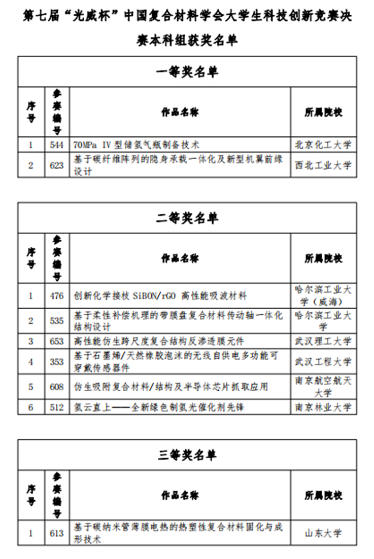 本网讯 近日,由中国复合材料学会、中国科普研究所、威海市科学技术局等单位主办,由威海光威复合材料股份有限公司、北京理工大学唐山研究院承办的第七届“光威杯”中国复合材料学会大学生科技创新竞赛全国决赛,在北京市国测国际会展中心落下帷幕,并在“中国复合材料学会第八次会员代表大会”现场进行了颁奖仪式。