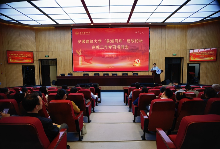 本网讯 10月31日,学校在南校区徽韵楼二楼报告厅举办“易海同舟”统战论坛之宗教工作专项培训会。包河区委统战部民宗科科长朱天扬作“认真贯彻党的二十大精神,进一步做好新形势高校宗教”专题培训报告。各基层党委(党总支)、国际教育学院负责统战(宗教)工作的分管领导,全校专兼职辅导员参会。会议由党委统战部常务副部长朱涛主持。