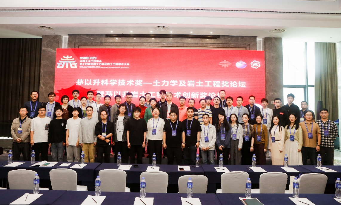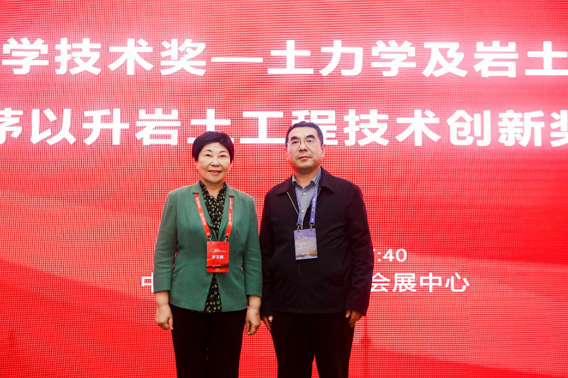 全国土力学及岩土工程学术大会开设“茅以升奖论坛”,旨在邀请近年来获茅以升青年奖的学者汇报最新研究成果,引领我国岩土工程发展。蔡国军教授在茅以升奖论坛做“智能地下探测新技术新方法—基于多功能CPTU测试的无黏性士状态参数与液化评价模型及应用”报告,并获得了与会代表一致高度赞赏,并与北京茅以升科技教育基金会理事长、茅以升之女茅玉麟合影。