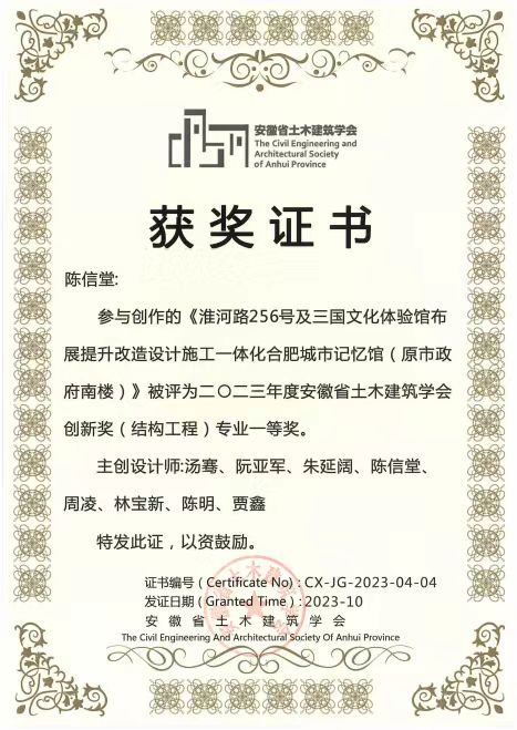 本网讯 近日,ku游官方土木学院陈信堂老师的项目“淮河路256号及三国文化体验馆布展提升改造设计施工一体化合肥城市记忆馆(原市政府南楼)”荣获2023年度安徽省土木建筑学会创新奖(结构工程)专业一等奖。