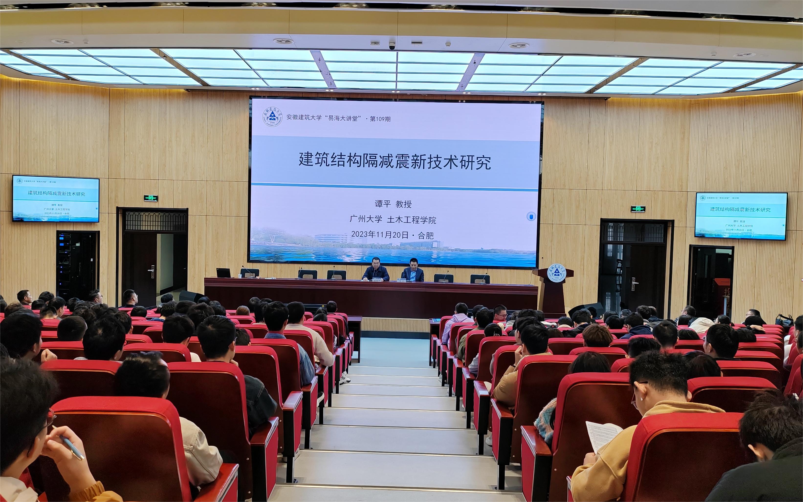本网讯 11月20日下午,由校党委宣传部主办,土木工程学院承办的第109期“易海大讲堂”在南校区徽韵楼二楼报告厅举行。广州大学土木工程学院院长兼抗震中心执行主任谭平研究员做客“易海大讲堂”,为我校师生带来题为《建筑结构隔减震新技术研究》《国家自然科学基金申报交流》的精彩报告。会议由校党委常委、副校长蔡国军教授主持,土木工程学院相关骨干教师、研究生及本科生近300人参加了本次报告会。