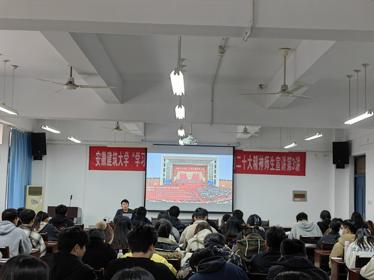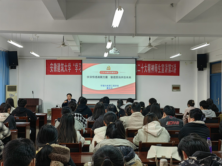 环境与能源工程学院党委书记戴前宏以《学深悟透凝聚力量 奋进担当共创未来》为题,紧扣党的二十大报告原文,从党的二十大的主题、过去5年的工作和新时代10年的伟大变革、新时代新征程中国共产党的历史使命、中国式现代化的本质要求等十五个方面对党的二十大精神作了深入解读。他强调,青年学子要肩负历史使命,坚定前进信心,立大志、明大德、成大才、担大任,努力成为堪当民族复兴重任的时代新人,让青春在为祖国、为民族、为人民、为人类的不懈奋斗中绽放绚丽之花。