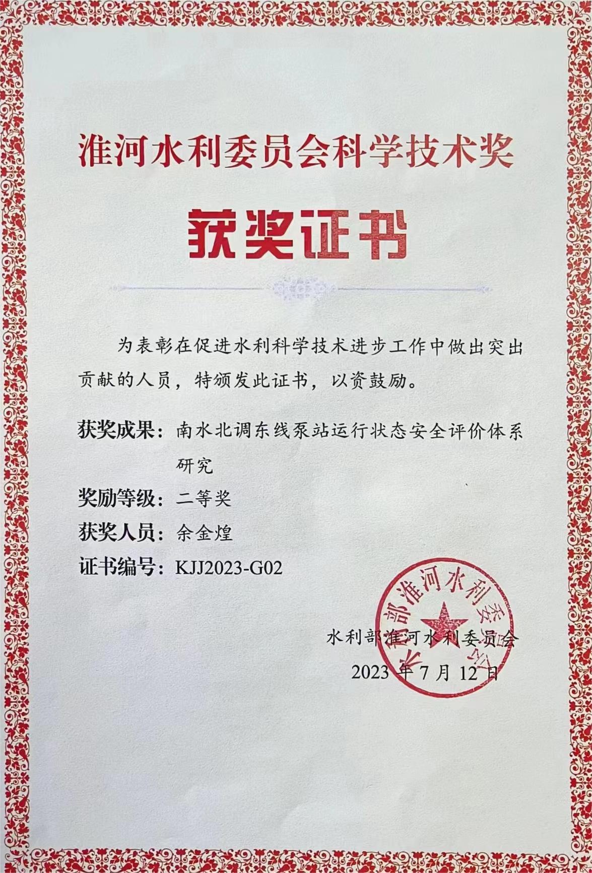 本网讯 近日,ku游官方土木工程学院教师余金煌申报的《南水北调东线泵站运行状态安全评价体系研究》荣获淮委科学技术奖二等奖。