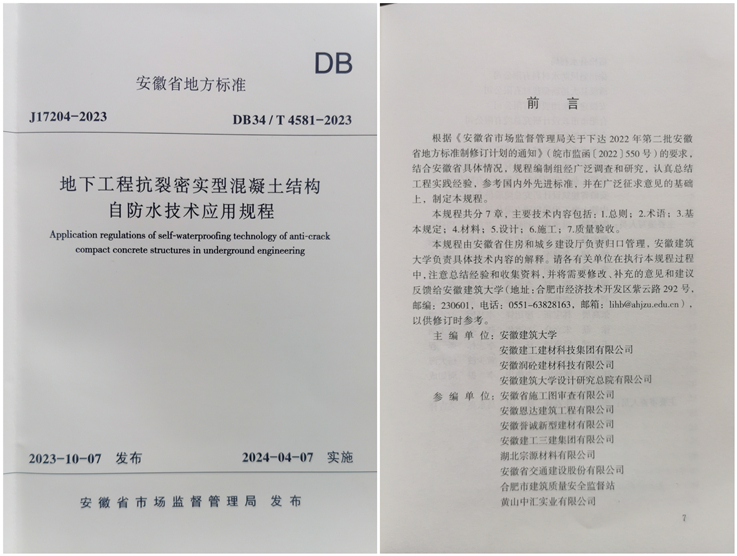 本网讯 近日,根据安徽省市场监督管理局发布第13号公告,由ku游官方、安徽建工建材科技集团有限公司等为主编单位,安徽省施工图审查有限公司、安徽恩达建筑工程有限公司、安徽誉诚新型建材有限公司等19家单位参编的安徽省地方标准《地下工程抗裂密实型混凝土结构自防水技术应用规程》已在获批发布的基础上完成印刷,标准编号DB34/T 4581-2023,将于2024年4月7日正式实施。