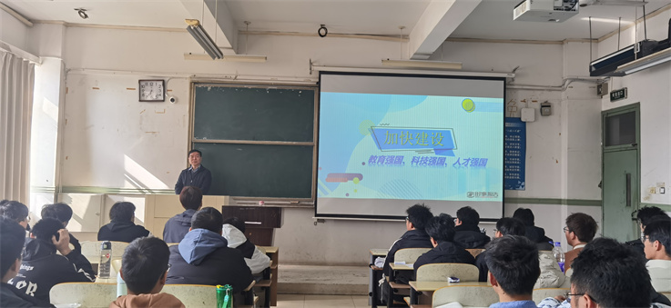 为23级道桥、交通专业的同学们讲授《加快建设教育强国、科技强国、人才强国》专题时,黄显怀结合我校近日参与承办的第三届中国高校科技成果交易会,深入浅出地分析建设教育强国、科技强国、人才强国三者的关系,强调了教育的重要性和不可替代性及国家对教育事业的重视和投入,阐明教育对人才的培养、科技的发展起到了关键的决定性作用。勉励同学们不断加强基础学科的学习和个人综合素养的提升,学精、学专、学有所长。