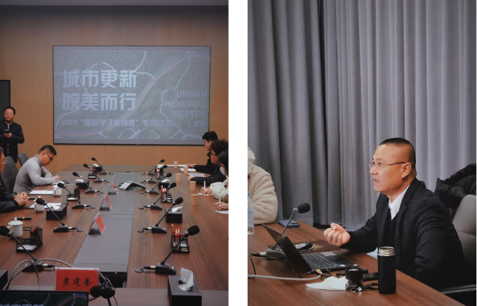 在合肥园博园智慧中心会议室,第十四届中国(合肥)国际园林博览会规划建设现场负责人、中国城市建设研究院有限公司风景园林专业院副院长袁建奎先生,以第十四届中国(合肥)国际园林博览会的规划、设计和施工为案例向大家分享了在当前“由增量建设转向存量提质”阶段中风景园林师的“现在与未来”以及当代大学生的挑战与机遇。