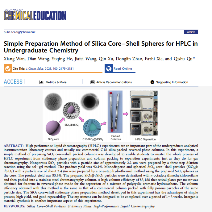 本网讯 近日,美国化学会旗下化学教育国际顶级期刊《Journal of Chemical Education》(JCE)发表了ku游官方材料与化学工程学院瞿其曙教授课题组的重要教学研究成果“Simple preparation method of silica core-shell spheres for HPLC in undergraduate chemistry”(J. Chem. Educ. 2023, 100, 2175-2181),这是学校首次在该期刊发表教育研究论文。JCE自1924创刊,是全球化学教育首屈一指的旗舰SCI期刊。该论文的发表实现了学校化学教育类教研论文在国际教育类顶级期刊零的突破。