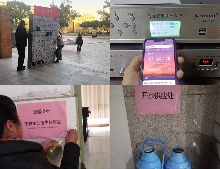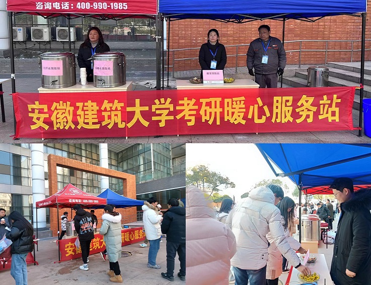 考试前夕,学校后勤管理处开展了考场内外环境及各类设施的检修工作。提前对考场的周边环境进行巡查,备用融雪剂、铲子等除雪设备,在易滑路段铺设防滑垫。安排专人认真排查课桌椅、照明、地砖、墙面、门窗、卫生间等设施,对教室、走廊、卫生间进行了全面彻底的清扫,调试了空调、电子钟、铃声、热水器等,以保障考试的顺利进行。此外,考试期间,提供徽学楼二层6间教室,供跨校区考生午休使用,并在各考场楼宇前设置暖心服务站,为学子们准备免费糖果、红糖姜茶、热水等,为考研学子驱散寒冷、加油打气。