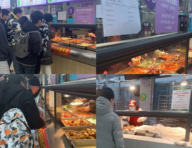 为帮助学子增强应考信心,学校各食堂推出爱心助考系列活动。考试期间,学生食堂为广大考生每日准备了免费爱心早餐一份,并在中餐推出优惠营养的考研套餐,供同学们选择。同时,食堂就餐大厅延迟关闭空调,为跨校区考生提供温舒适的休息场所,并免费提供红糖姜汤和开水等,让同学们御寒。