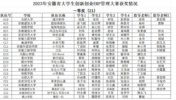 本网讯 近日,由安徽省教育厅主办、合肥大学承办的2023年安徽省大学生创新创业ERP管理大赛顺利落下帷幕。ku游官方经管学院刘伟、赵启赞、周旭、陶梦然、朱梦岩、梁飞越等同学组成的5支代表队,与来自合肥工业大学、安徽农业大学、安徽财经大学、安徽理工大学等在内的36所省内本科高校的166只队伍、近800名学生同台竞争,以优异的成绩斩获全部21个省级一等奖中的5个一等奖,并成功晋级国赛,获奖数量和质量再上新台阶。