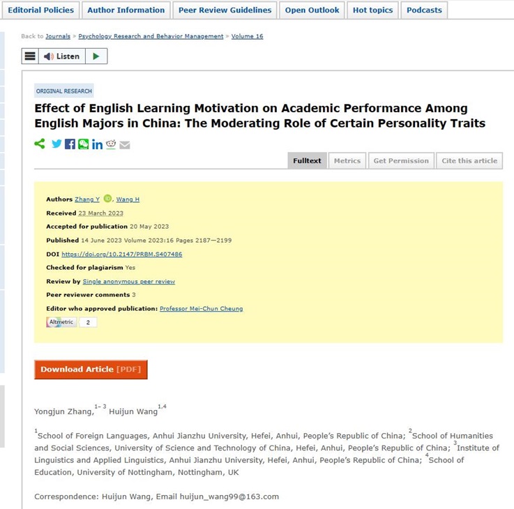 本网讯 近日,ku游官方外国语学院18级本科生汪慧俊同学在SSCI收录期刊Psychology Research and Behavior Management发表学术论文“Effect of English Learning Motivation on Academic Performance Among English Majors in China: The Moderating Role of Certain Personality Traits”。该论文的指导老师为外国语学院张永军老师。
