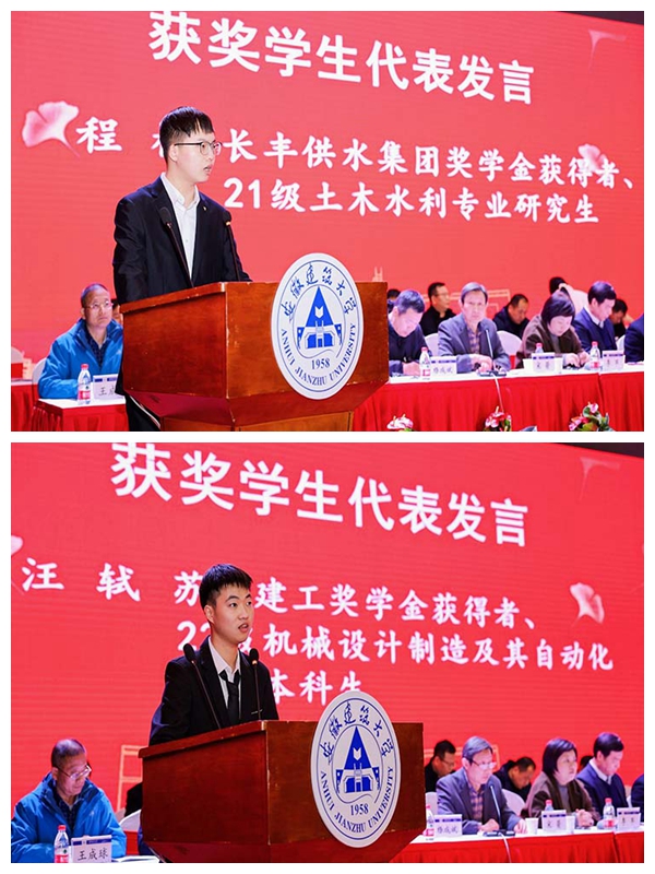 学生代表发言,“苏州建工”奖学金获得者、机械设计制造及其自动化专业学生代表汪轼,“长丰供水”奖学金获得者、土木水利专业研究生程椿作为学生代表发言,他们向设奖单位以及学校、老师表示感谢,并表示今后将勤勉刻苦,不负期待,努力成长成才,回馈母校,回馈社会。