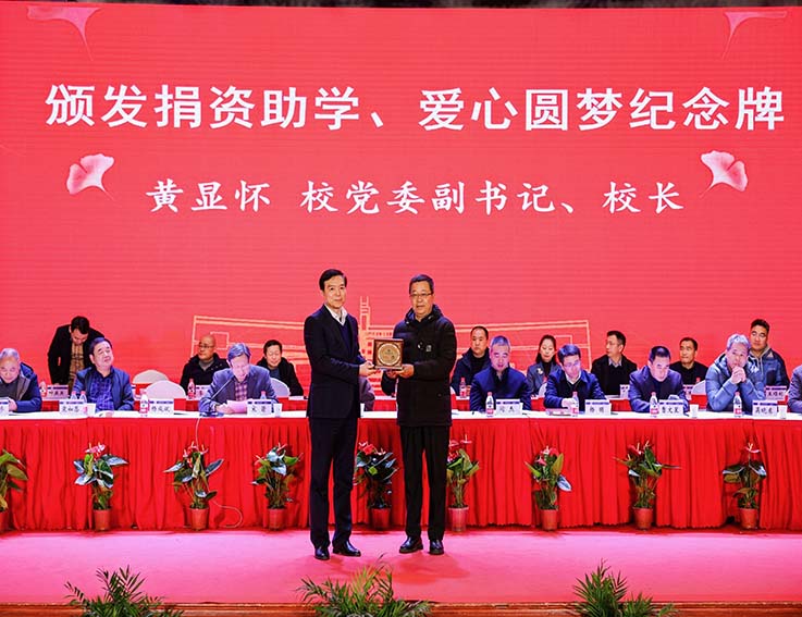 在颁奖、颁证环节,黄显怀和各设奖单位代表依次为306名获奖学生颁发荣誉证书,黄显怀向设奖单位代表颁发“捐资助学、爱心圆梦”纪念盘。
