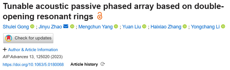 龚书磊同学为该论文的第一作者,赵瑾瑜老师为该论文的第二作者以及通讯作者。龚书磊同学在个人努力以及赵瑾瑜老师的悉心指导下,阅读了大量声学超材料的相关文献,了解了声学超材料的应用领域以及基本原理,最终确定了选题。依托于安徽省建筑声环境重点实验室研究平台,龚书磊同学拟定了论文的初稿,在课题组赵瑾瑜老师、刘袁老师和李永畅老师的指导下不断修改完善,在2023年10月6日投稿,最终在2023年12月2日被AIP Advances接收。(作者:龚书磊 赵瑾瑜;审稿:戈慈水)